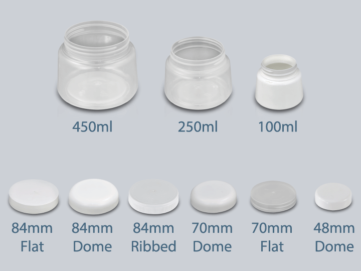 Adding on-shelf appeal is our CONICAL range. With a broad base that tapers towards the shoulder, this range is ideal for cosmetic applications. Produced from polypropylene using injection stretch blow moulding, the jars have a high gloss finish and can be produced in either clear or opaque colours. Available in 3 sizes, the 250ml and 450ml are compatible with various lid options to further customise the look and feel. The 100ml is only available in 48mm DOME finish.