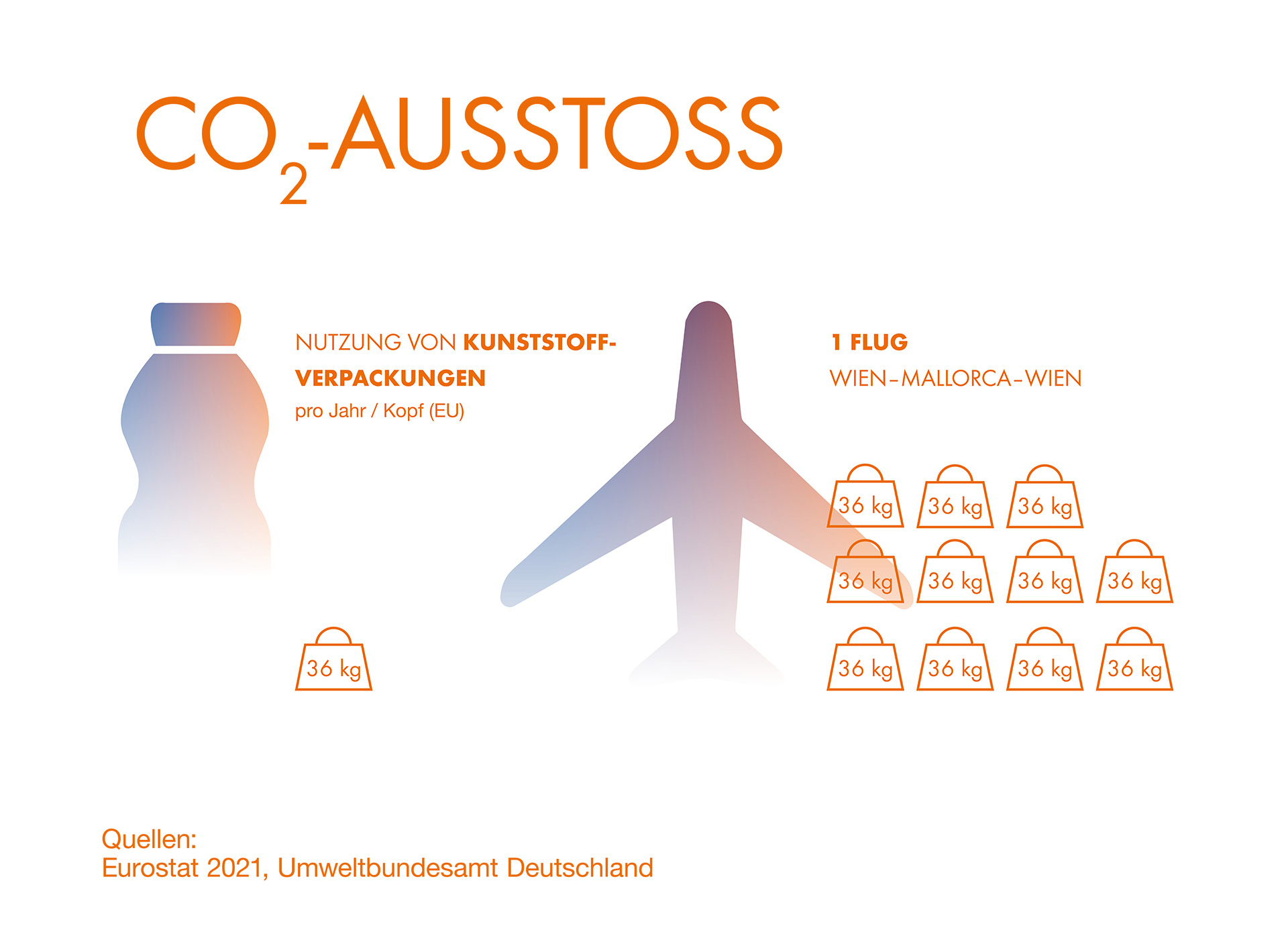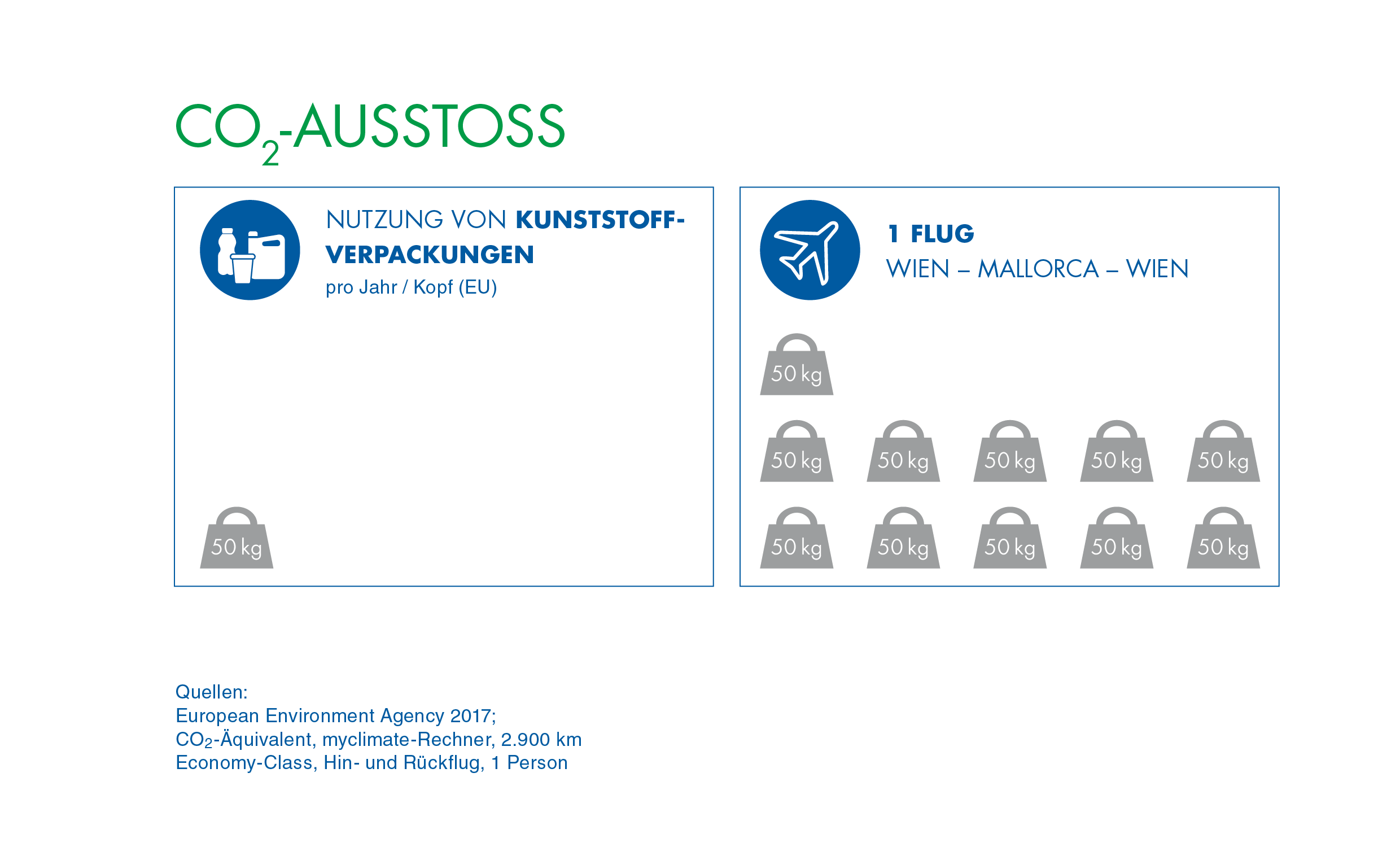 - Durch einen einzigen Flug von Wien nach Mallorca und zurück wird so viel CO2 freigesetzt wie durch die Nutzung von Kunststoffverpackungen in ca. 11 Jahren!