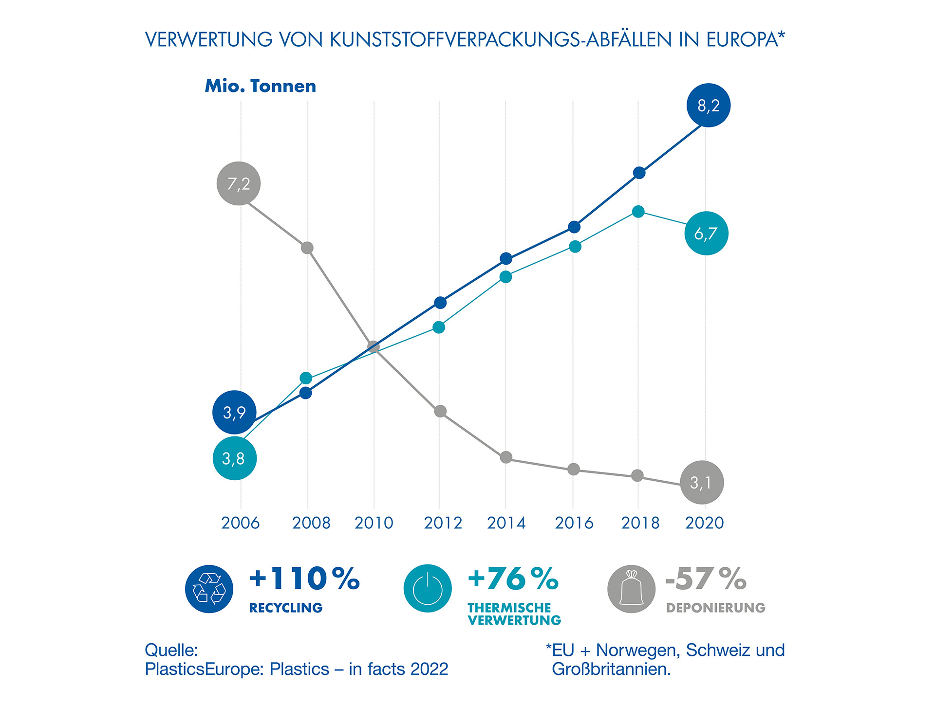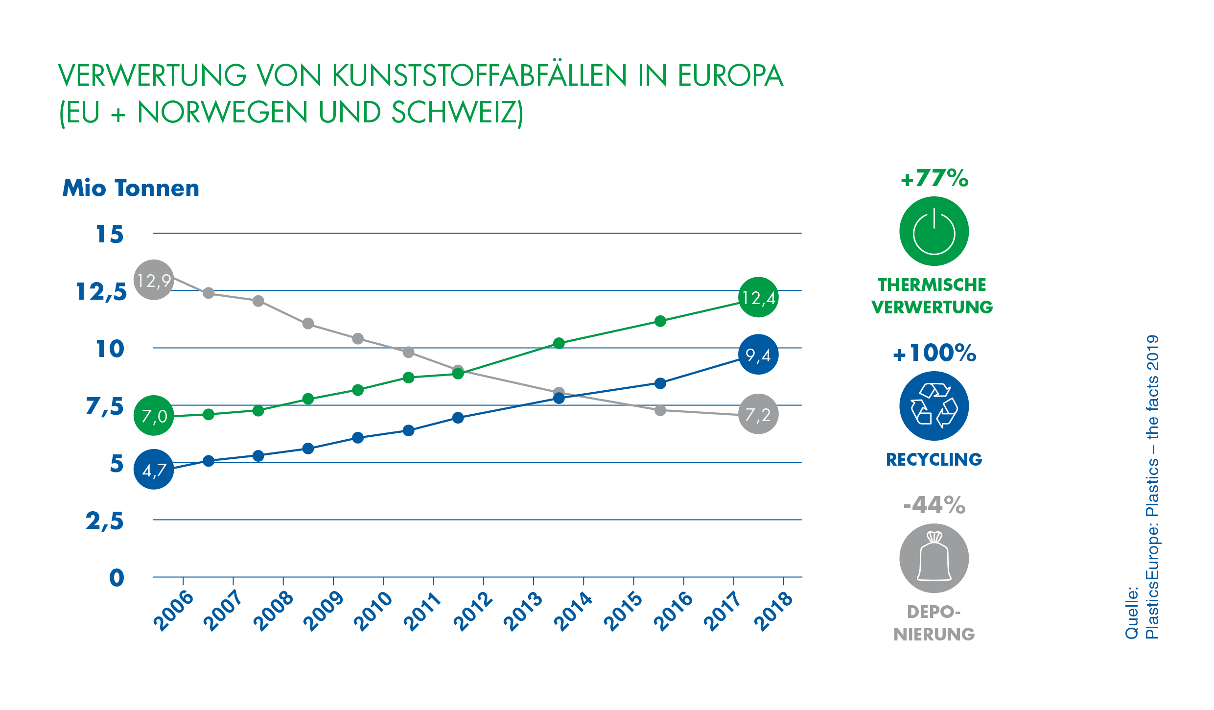 - Davon wird nur ein kleiner Anteil deponiert – Tendenz kontinuierlich sinkend. Entsprechend steigen die Anteile von recyceltem und thermisch verwertetem Kunststoffabfall.