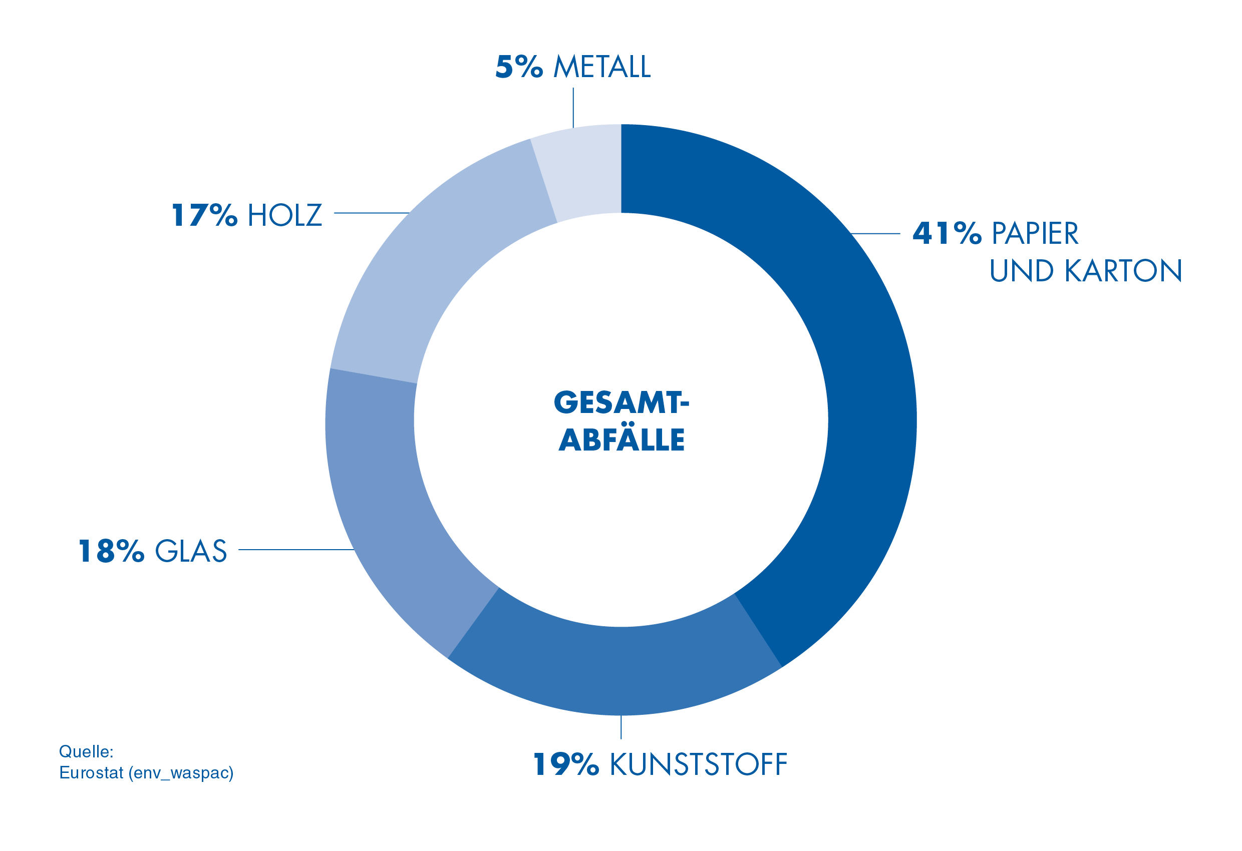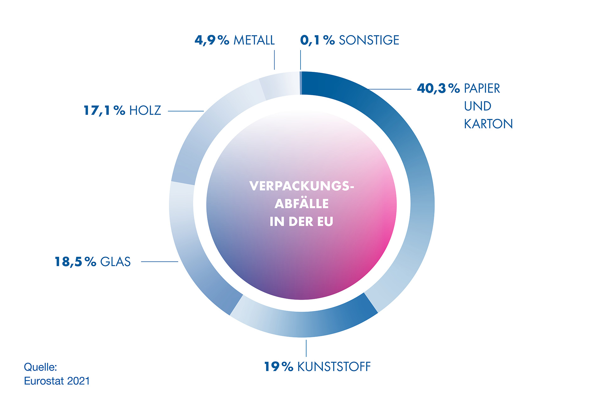 - In der EU machen Kunststoffverpackungen nur 19 Prozent des gesamten Verpackungsmülls aus. Knapp dahinter folgen Glas mit 18,5 Prozent und Holz mit 17,1 Prozent.