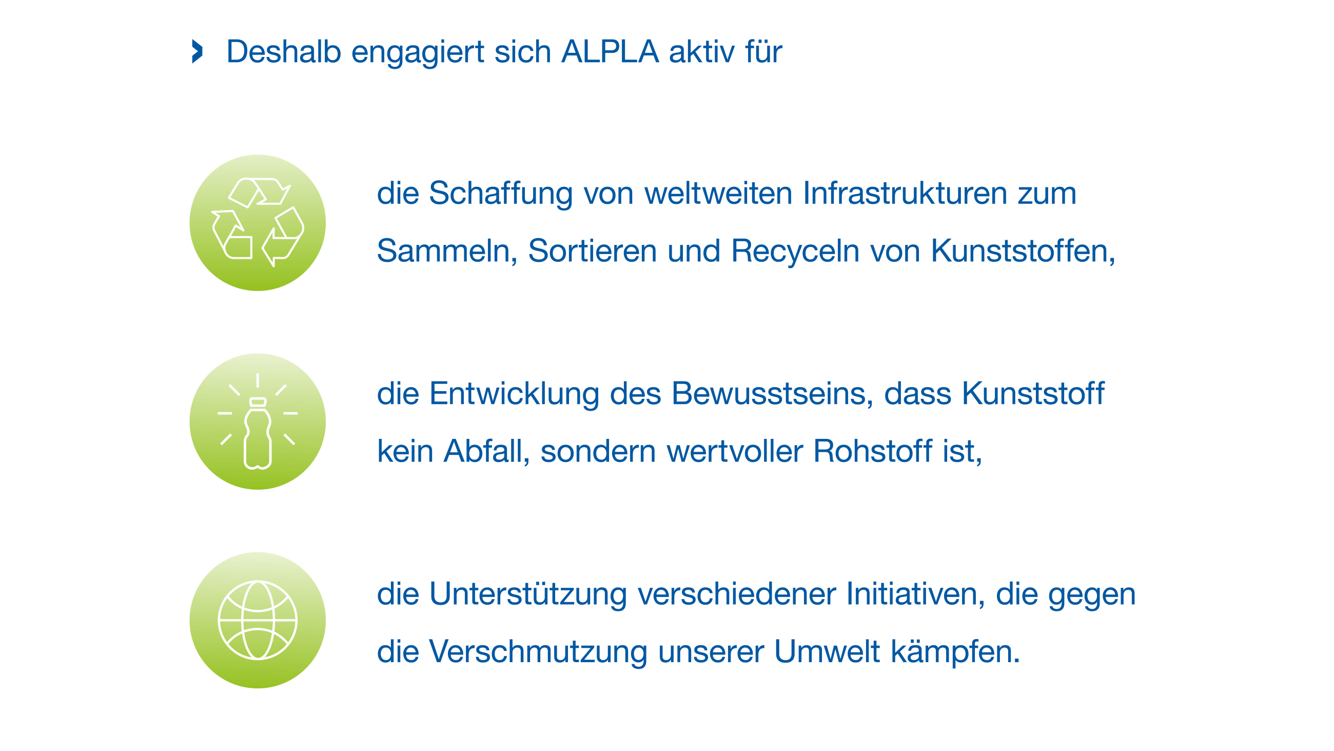 ALPLA gehört zu den Pionieren in der Entwicklung und Produktion nachhaltiger Verpackungslösungen aus Kunststoff und geht bis heute mit gutem Beispiel voran. Wir betreiben weltweit eigene Recyclingwerke. Zudem arbeiten wir im Rahmen von Kooperationen daran, den Einsatz von Ressourcen zu optimieren, die Herstellung hochwertiger Rezyklate weiter voranzubringen und Mehrweglösungen zu entwickeln.