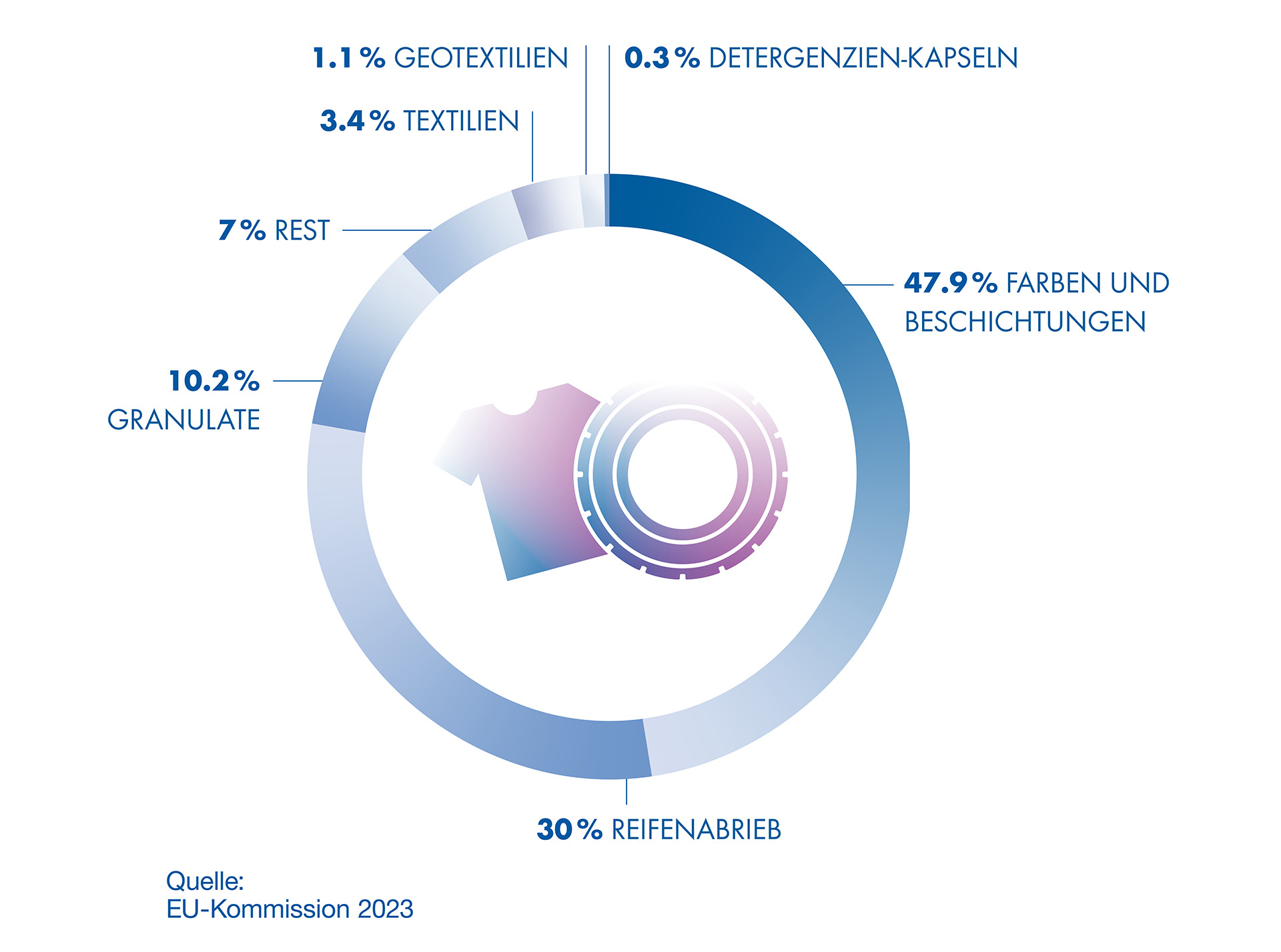 Mikroplastik gelangt aus vielen verschiedenen Quellen in die Umwelt. Zahlen aus dem Dokument der EU-Kommission zeigen die größten Quellen für die unbeabsichtigte Freisetzung von Mikroplastik in die Umwelt in der EU wie folgt – basierend auf den jeweils höchsten Schätzungen: