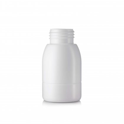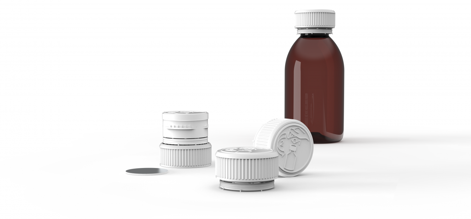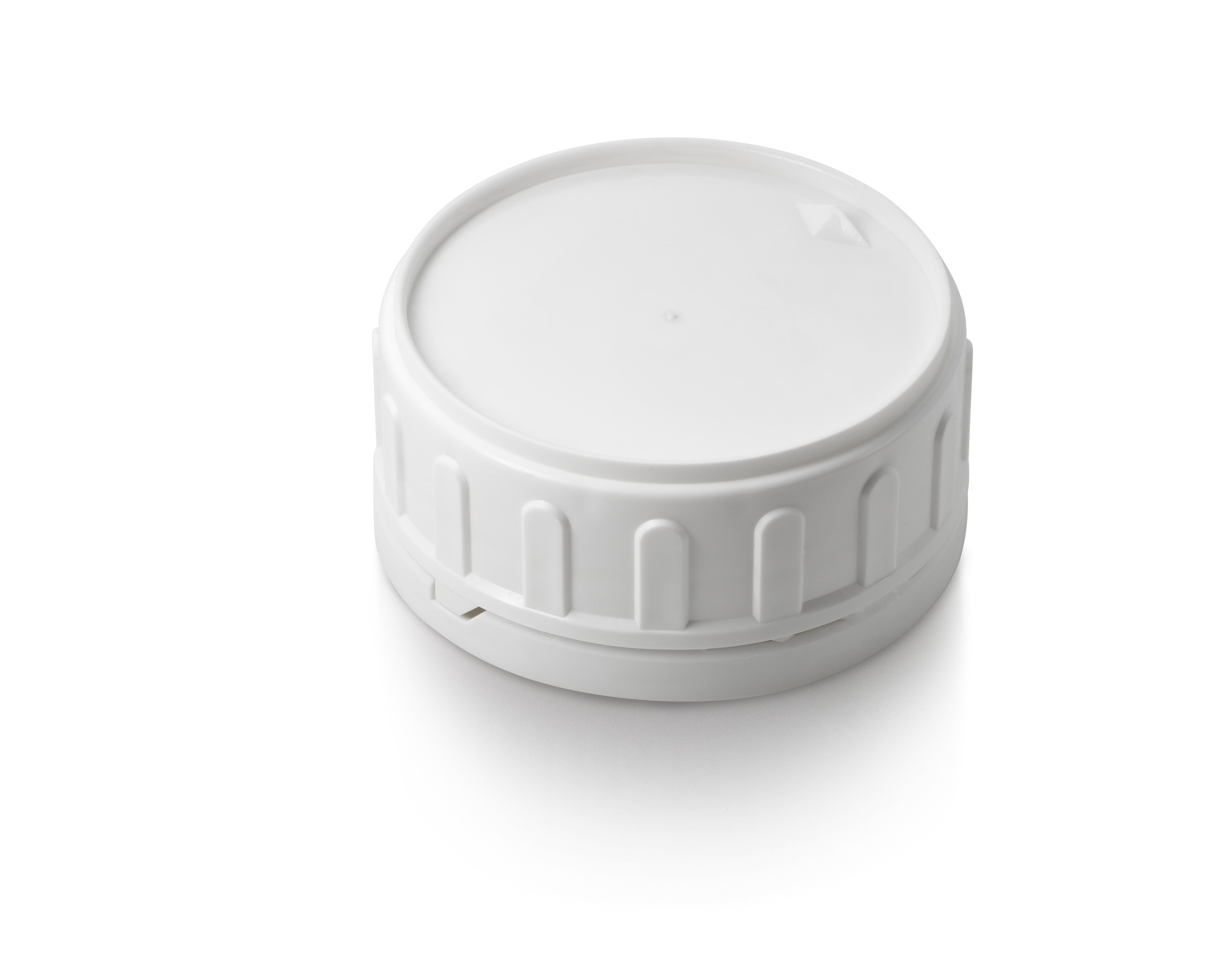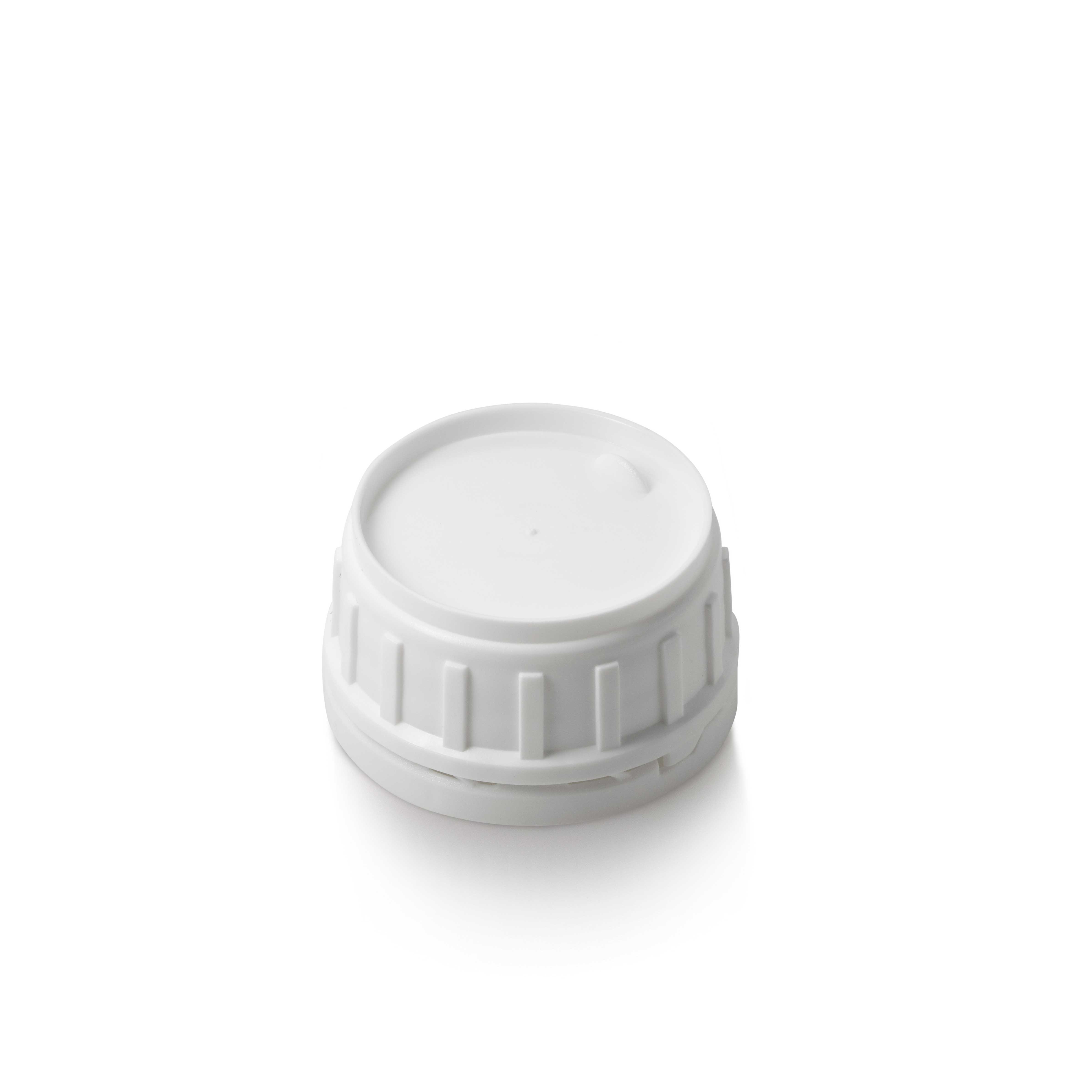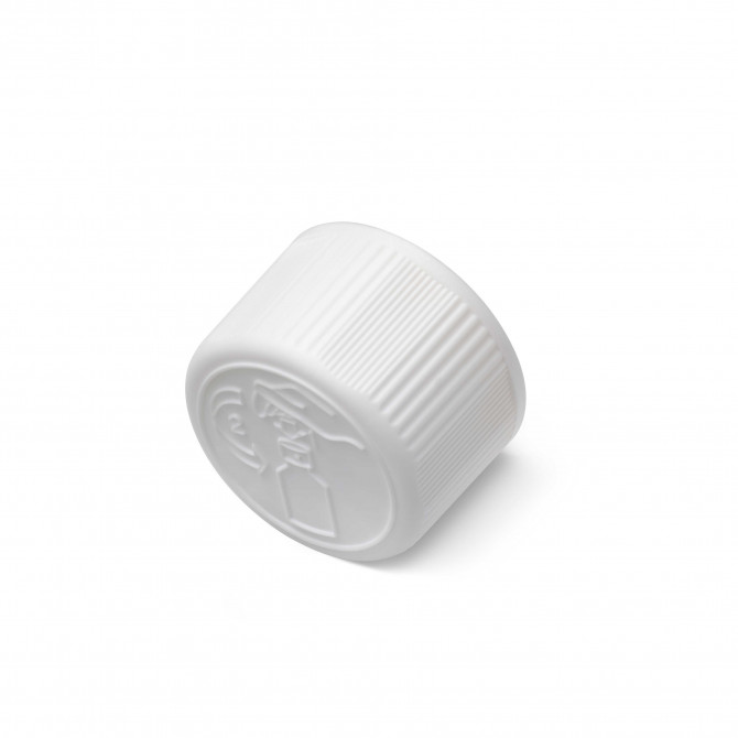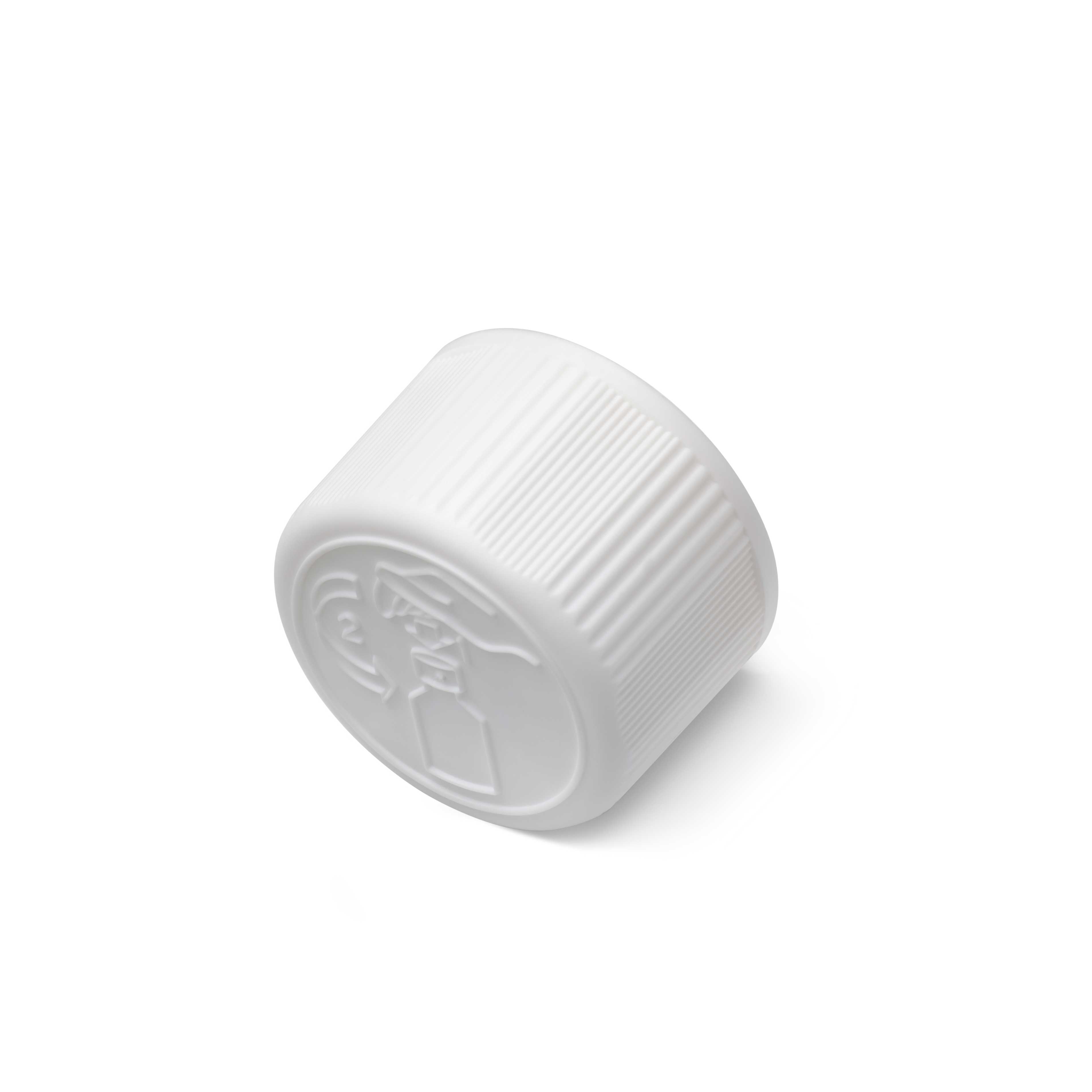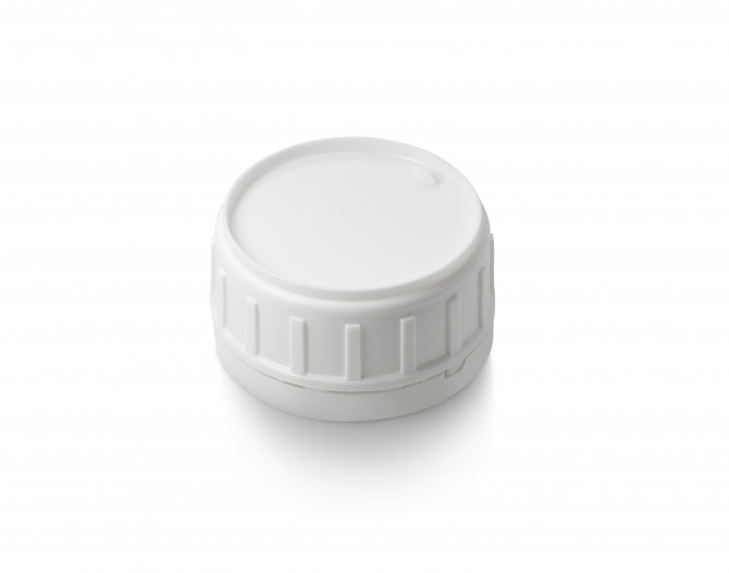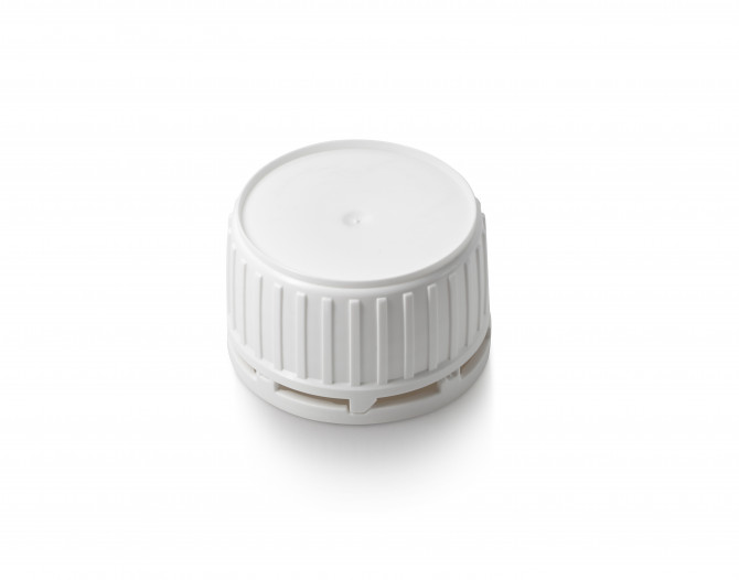 The child-resistant closure (CRC) of 28 mm diameter is available in white. The safety ring is available in different colours upon request. The closure fits PET and PE bottles and has an I.S. liner.
