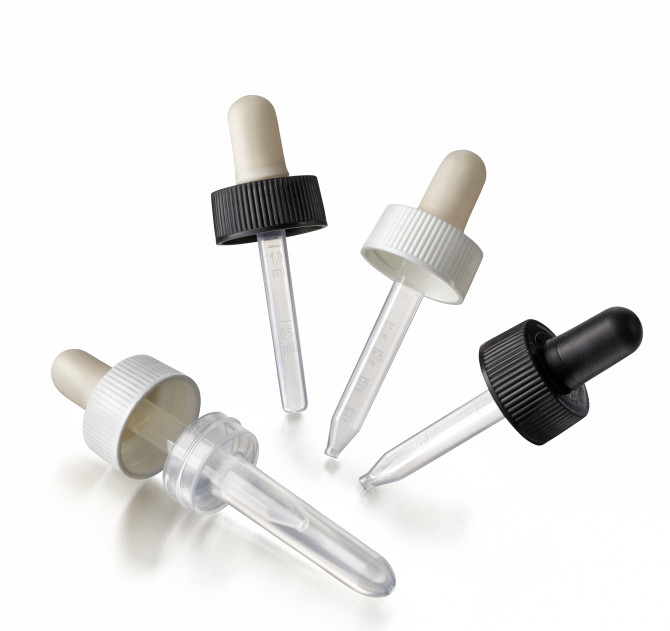 Bottles with dropper attachments and closure for measuring eye drops or other liquids.