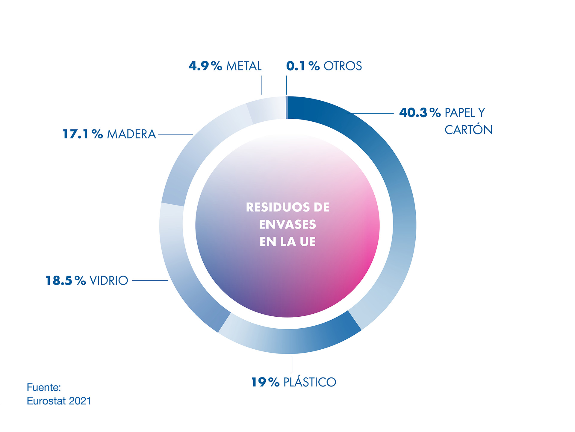- En la UE, los envases de plástico constituyen solo el 19 % del total de basura de envases. Le siguen de cerca el vidrio con el 18,5 % y la madera con el 17,1 %.