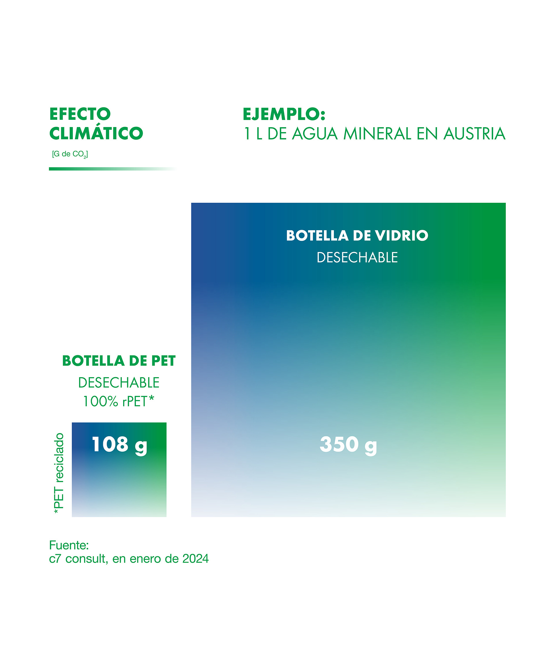- El punto de fusión del vidrio es 1600 °C, mientras que el del PET es de solo 260 °C. Por eso durante la producción de botellas de PET para bebidas se consume menos energía y se emite menos CO2 que durante la producción de botellas de vidrio.