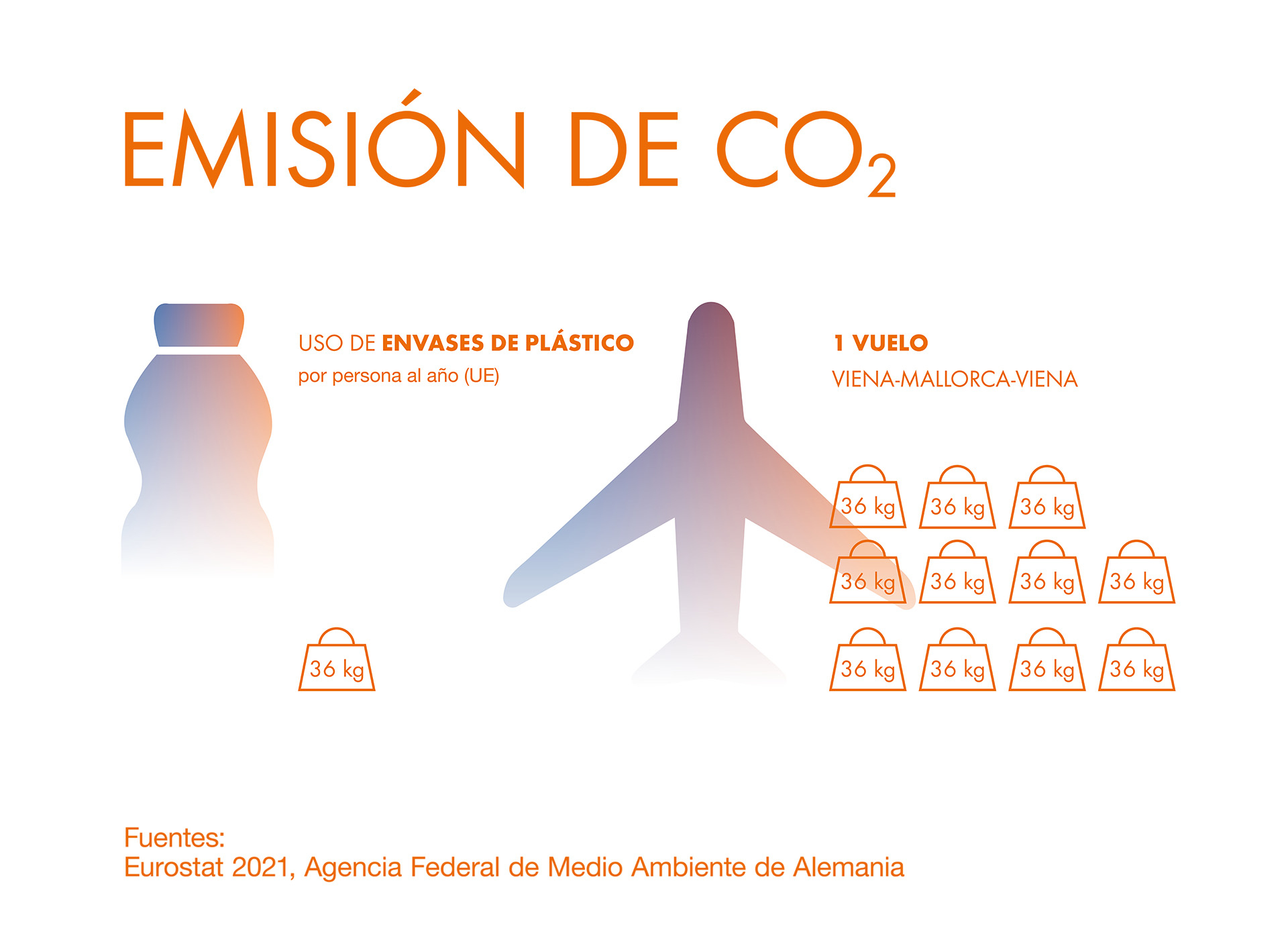 - ¡La emisión de CO2 que se genera en un solo vuelo de ida y vuelta entre Viena y Mallorca equivale aproximadamente a la generada por el uso de envases de plástico en unos once años!
