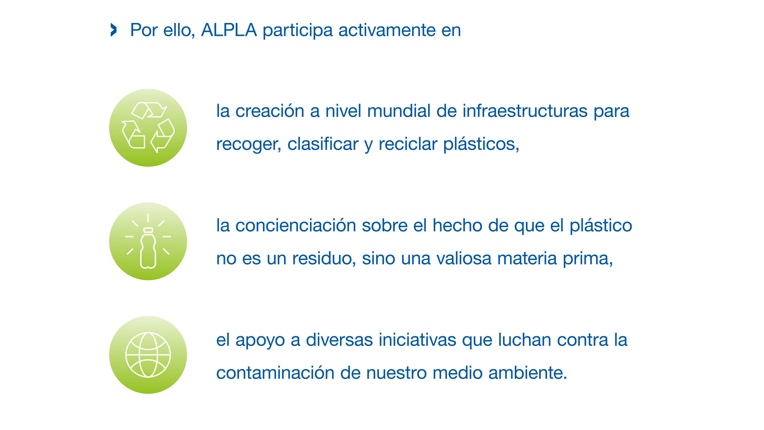 ALPLA es una de las pioneras en desarrollo y producción de soluciones de envasado sostenibles de plástico y sabe predicar con el ejemplo. Operamos plantas de reciclaje propias en todo el mundo. Además, en el marco de colaboraciones trabajamos para optimizar el uso de los recursos, avanzar en la producción de reciclados de alta calidad y desarrollar soluciones reutilizables