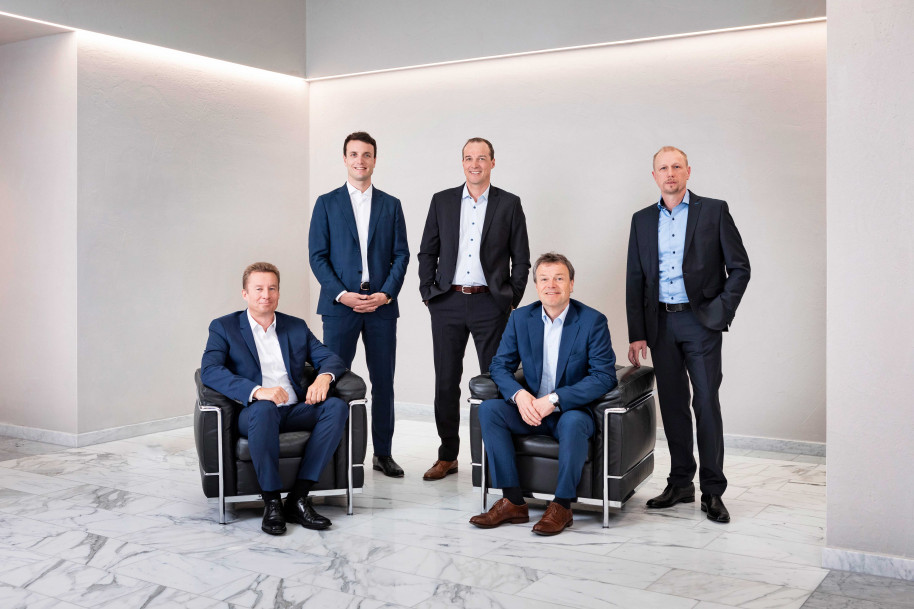 De la gauche vers la droite : Ricardo Rehm (Directeur financier), Walter Ritzer (Directeur de l’exploitation), Nicolas Lehner (Directeur commercial), Philipp Lehner (Directeur général), Klaus Allgäuer (Directeur de la technologie).