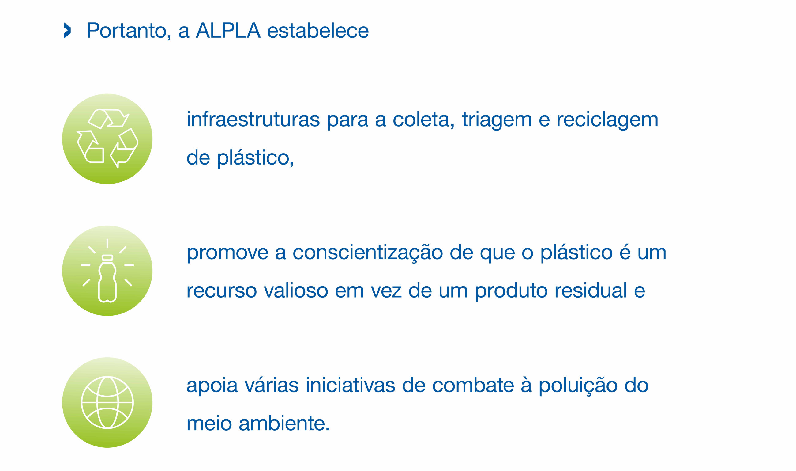 A ALPLA é pioneira no desenvolvimento e na produção de soluções em embalagens sustentáveis utilizando plástico e até hoje é exemplo no mercado. Operamos nossas próprias plantas de reciclagem ao redor do mundo. Também nos envolvemos em parcerias que visam otimizar o uso dos recursos, continuar avançando a produção de materiais reciclados de alta qualidade e desenvolver soluções de reúso.