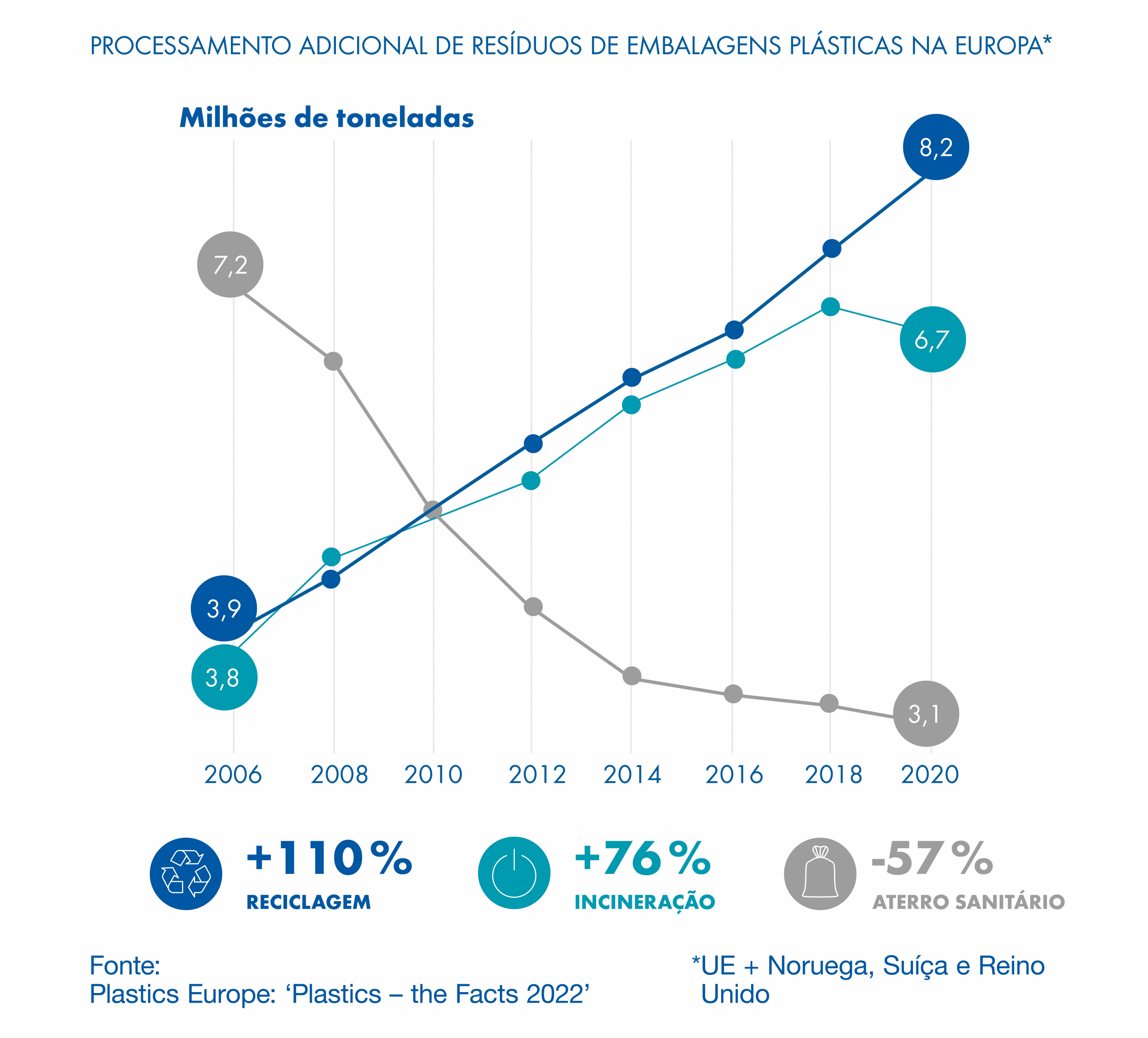 - Apenas uma pequena proporção disso é usada como aterro – e isso está diminuindo o tempo todo. Consequentemente, a proporção de resíduo plástico reciclado e incinerado está crescendo.