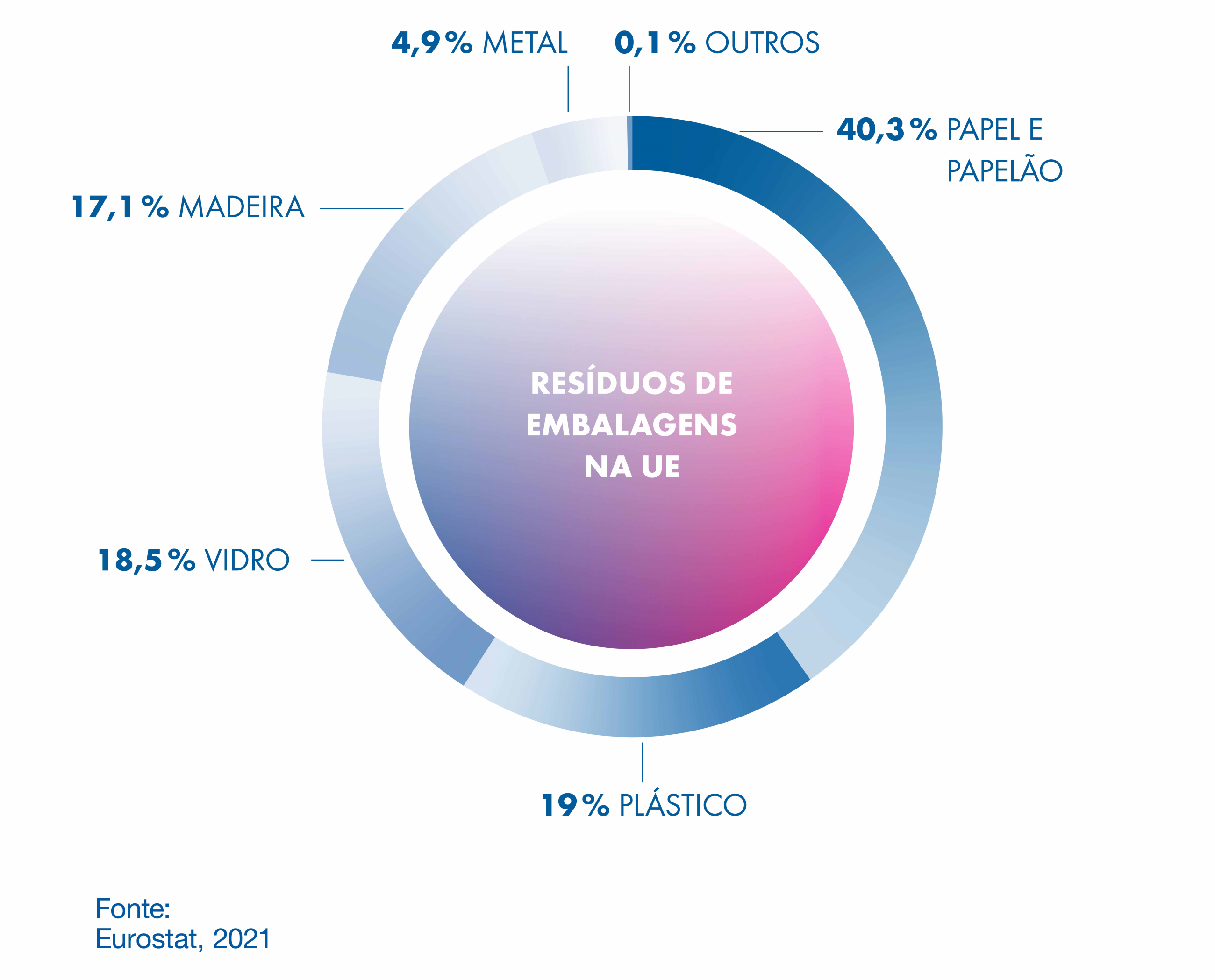 - Elas compreendem apenas 19% de todos os resíduos de embalagens na UE, seguidas de perto pelo vidro, com 18,5%, e pela madeira, com 17,1%.
