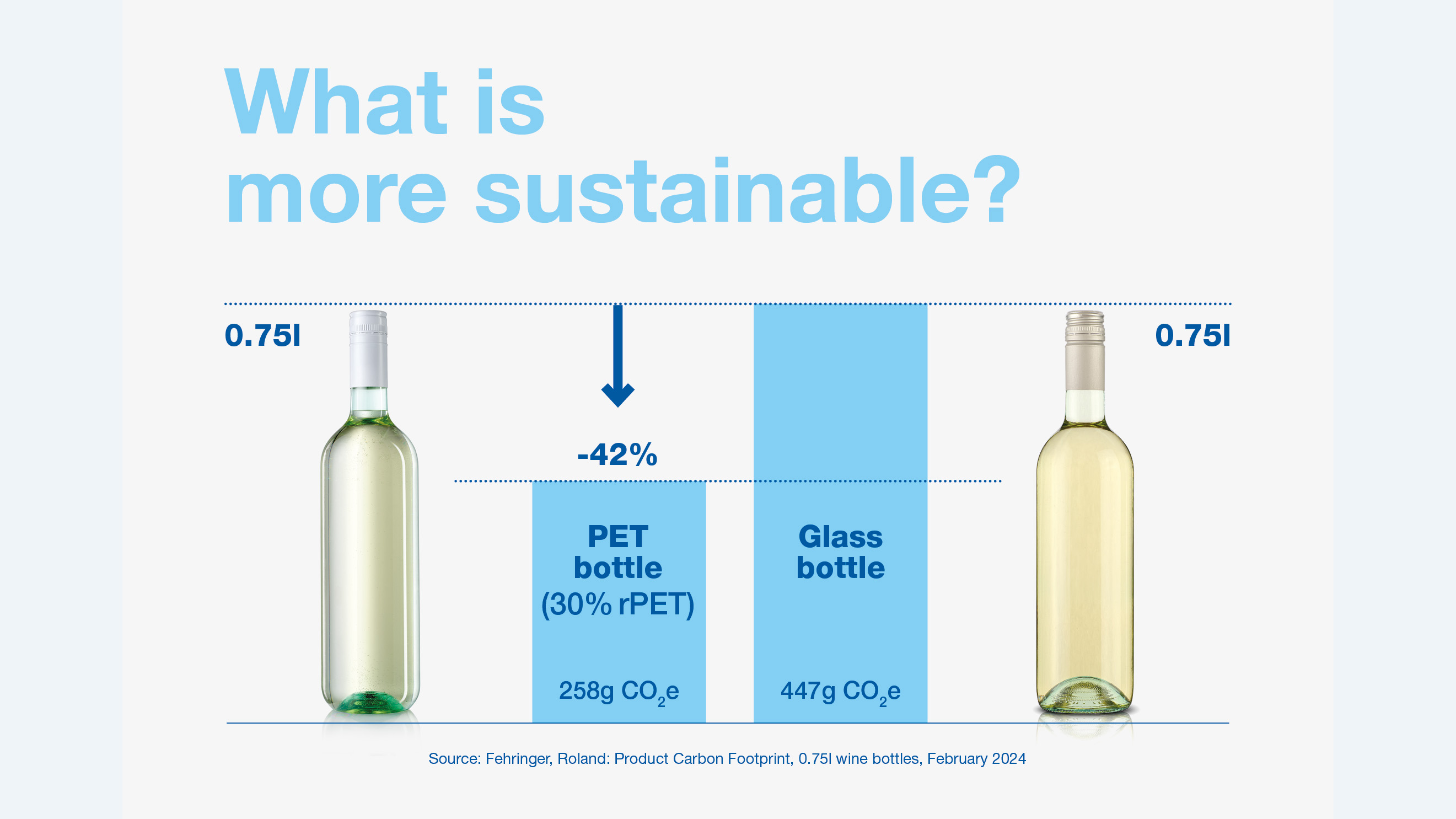 Optar por nossa garrafa de vinho de 30% de rPET não é apenas uma escolha de qualidade. É uma escolha para o meio ambiente. Se comparada com uma garrafa de vidro padrão, nossa garrafa plástica de vinho tem uma pegada de carbono 42% menor. Ao escolher nossa garrafa, você terá uma embalagem totalmente reciclável, apoiando uma economia circular e reduzindo o desperdício.