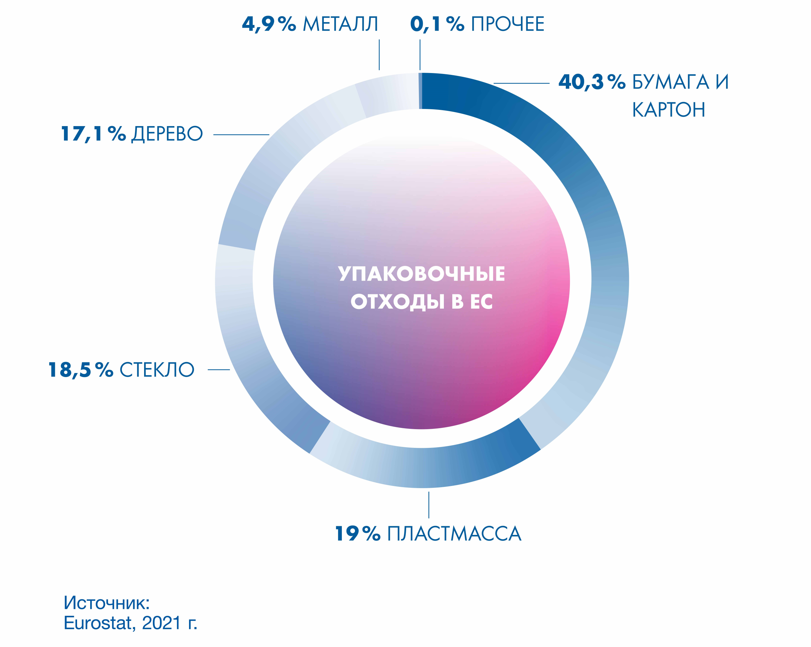 - Пластиковая упаковка составляет всего лишь 19 % всех упаковочных отходов в ЕС, сразу за ней следует стекло (18,5 %) и дерево (17,1 %).