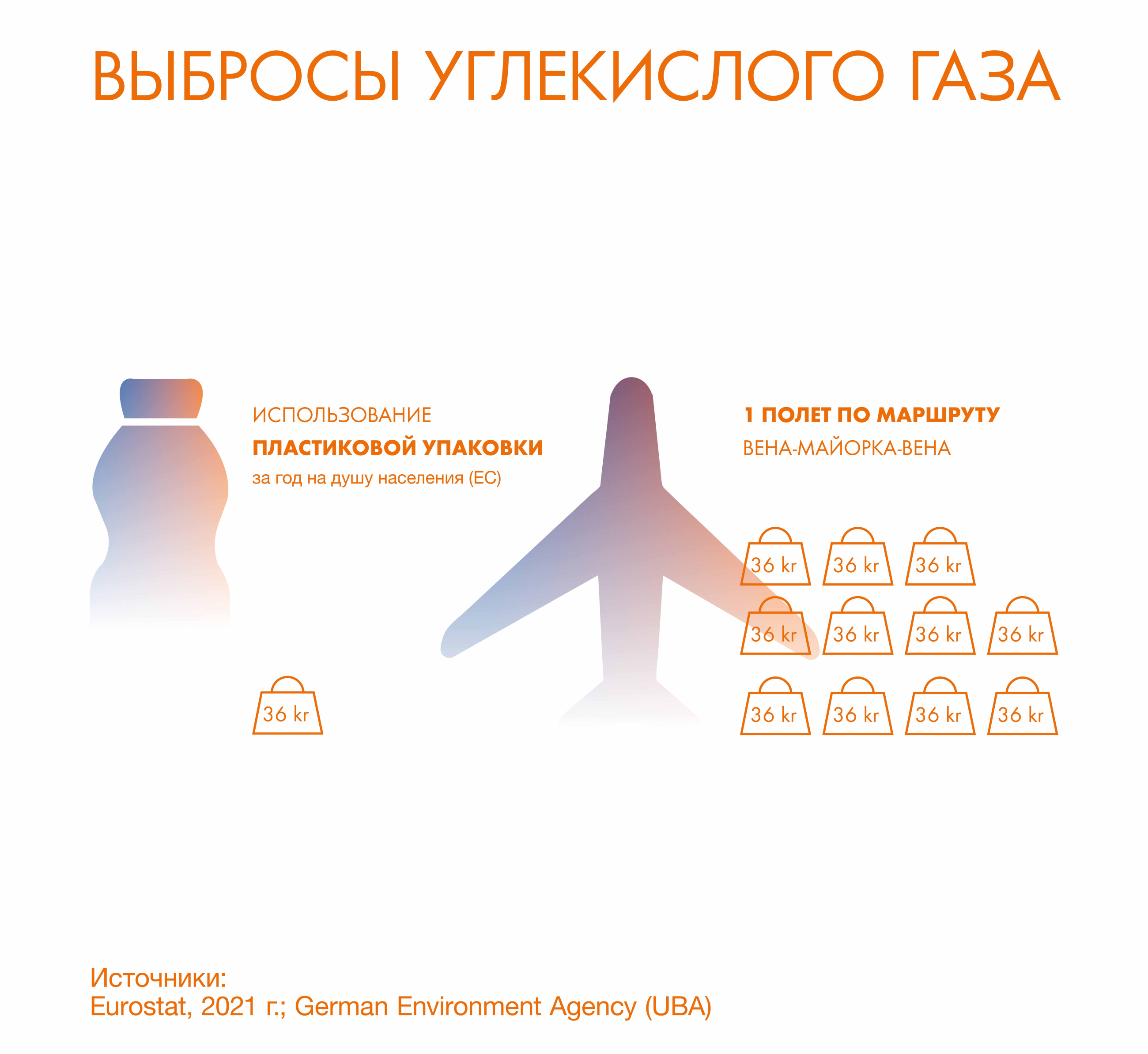 - Во время всего лишь одного полета из Вены на Мальорку и обратно происходит выброс углерода равный приблизительно 11 годам использования пластиковой упаковки!